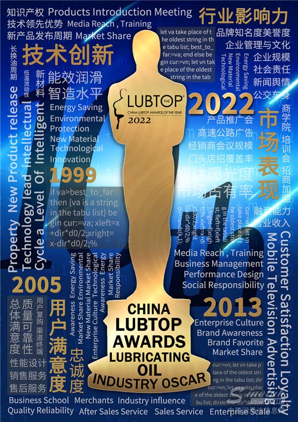 "LubTop总评榜”评选活动始于2013年,每年一届,本届是第10届(10th)。评选活动以技术创新、市场表现、用户满意度、行业影响力等四大维度为品牌核心评价体系,持续创新活动模式,发现好产品,彰显好品牌。"LubTop2022总评榜”将在企业申报资格海选,第三方权威机构质量检测结果(一票否决权)基础上,通过线上用户投票(占比30%)、专业市场调研(占比20%)、专家导师团评审(占比40%)、媒体观察评议(占比10%)流程,以线上线下大数据+智能算法产生LubTop品牌荣誉指数,确定LubTop2022中国润滑油行业年度总评榜榜单。