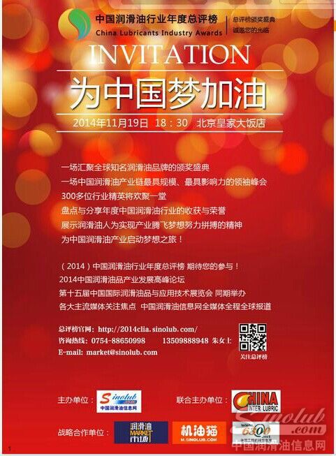 一场汇聚全球知名润滑油品牌的颁奖盛典----(2014)中国润滑油行业年度总评榜颁奖典礼11月19日(周三)18:30-20:30与您相约北京皇家大饭店 [详情]