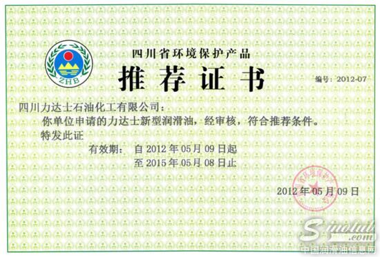 8月15日,四川力达士公司从省环保厅获得四川省环境保护产品推荐证书,这标志着力达士新型润滑油已被列为我省绿色环保产品。 [详情]