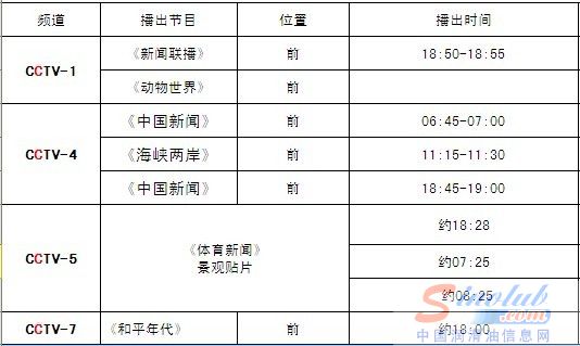 3月24日起,东昊油品将在央视一套(综合频道)、四套(国际频道)、五套(体育频道)和七套(军事农业频道)的黄金时段,强势打造东昊品牌广告 [详情]