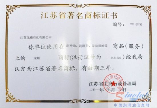 日前,龙蟠石化公司再一次被江苏省工商行政管理局评为“江苏省著名商标” 。这也是龙蟠石化自2003年以来,连续第九年获得“江苏省著名...[详情]