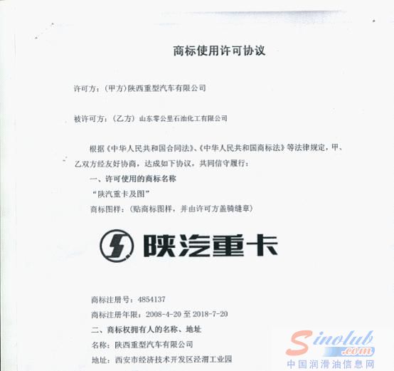 陕西重型汽车有限公司与山东零公里石油化工有限公司签订“商标使用许可协议”。协议规定山东零公里石油化工有限公司有权使用商标注册号...[详情]