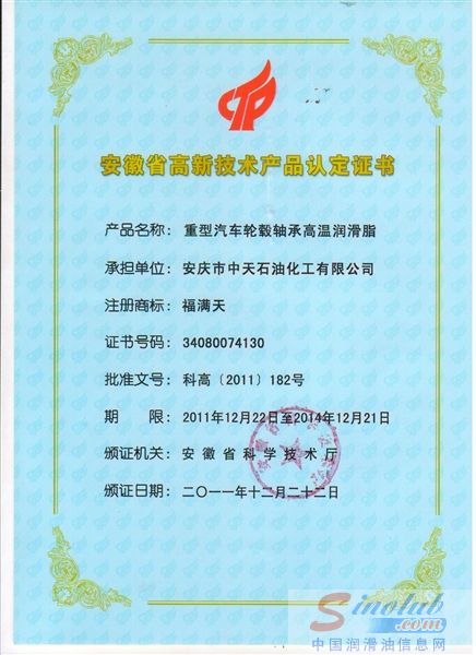 2011年12月,安庆市中天石油化工有限公司FKC重负荷开式齿轮专用润滑脂和重型汽车轮毂高温润滑脂荣获安徽省高新技术产品认定证书。 [详情]