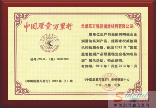 舜能陶瓷合金润滑油2012年被《中国质量万里行》评为“国家监督检测产品质量稳定合格知名品牌” 舜能陶瓷合金润滑油系列产品,经国...[详情]