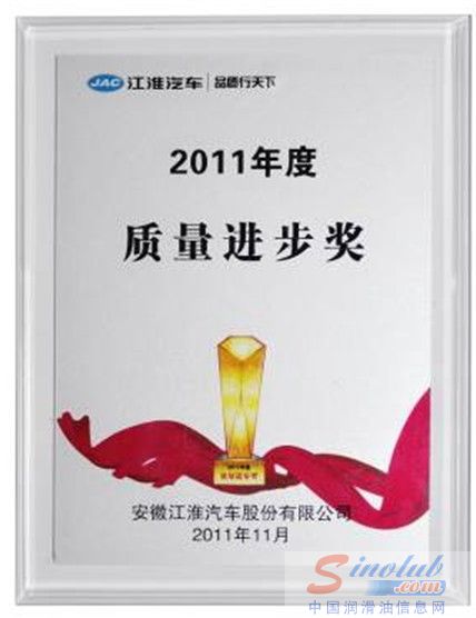 日前,龙蟠石化公司接到安徽江淮汽车股份有限公司的通知:龙蟠石化在江淮汽车众多供应商中脱颖而出,获得江淮汽车“2011年度质量进步奖 [详情]