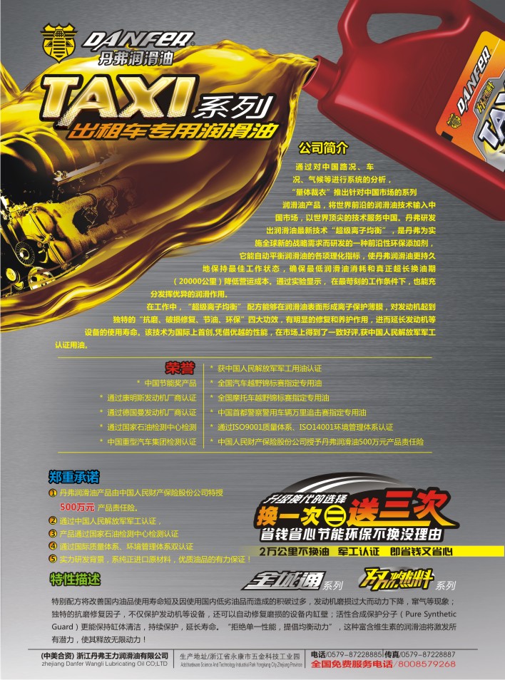 12月1日,丹弗润滑油系列产品又添新军---全城通系列隆重上线。该款系列产品针对出租车市场特点而专业研发,针对出租车长期低速、频繁换 [详情]