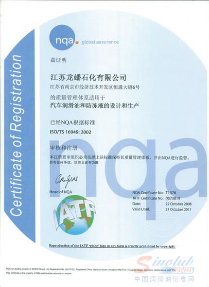 11月14日,龙蟠石化收到了英国国家质量保证有限公司(NQA, National Quality Assurance)正式颁发的证书,宣布龙蟠顺利通过TS16949认 [详情]