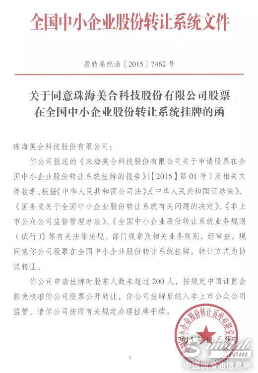 2015年11月9日,美合科技(股票代码:834412)正式获得全国中小企业股份转让系统有限责任公司批复,同意珠海美合科技股份有限公司在全国 [详情]