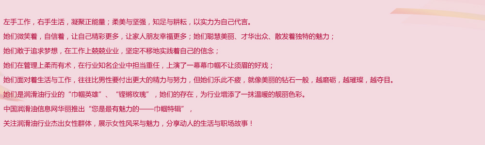 她热爱生活,热衷工作;她是一位热情洋溢的美国女子,在谈吐间不时流露知性与睿智;她是职场的女强人,有着不屈不挠的毅力;她离开家乡,来到了中国,担任在全球有着60年精彩传奇的WD-40品牌中国区总经理。她笑言,女人当自强,做真实的自己,是自己的人生格言。