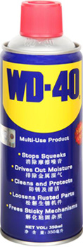 快速而大量地使用WD-40产品,能使水浸设备快速启用,当机械设备、机电设备、汽车等浸水后,可用WD-40产品进行保养。左图为WD-40除湿防锈润滑剂。
