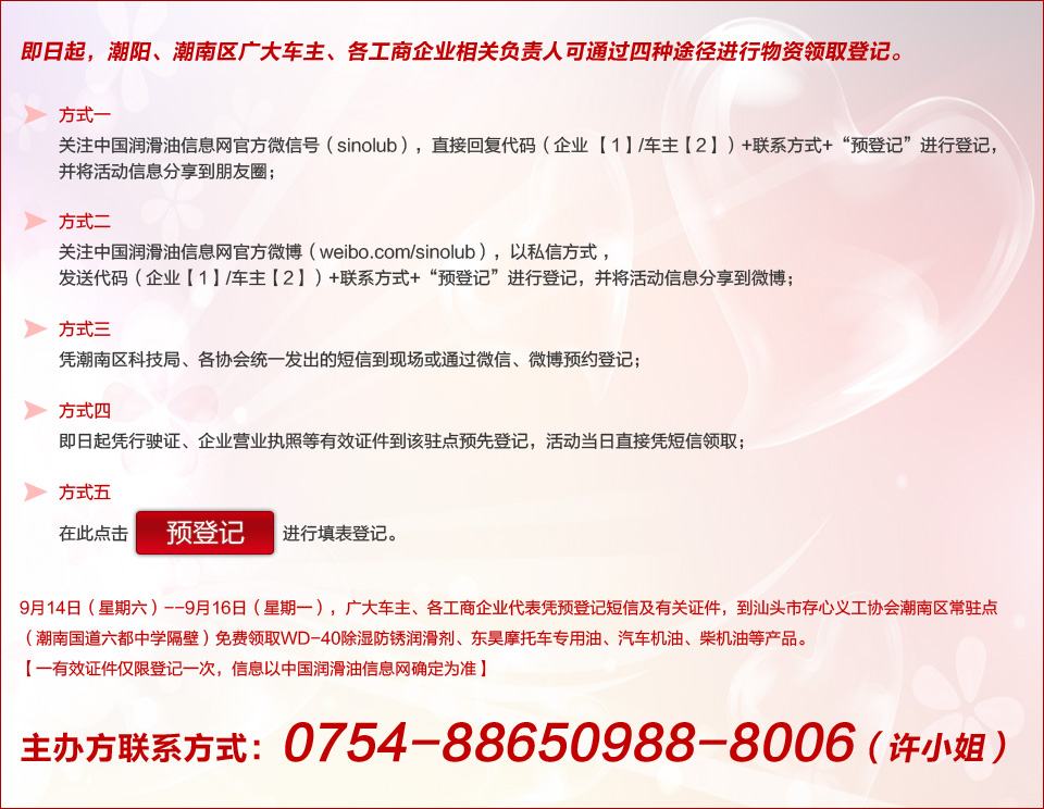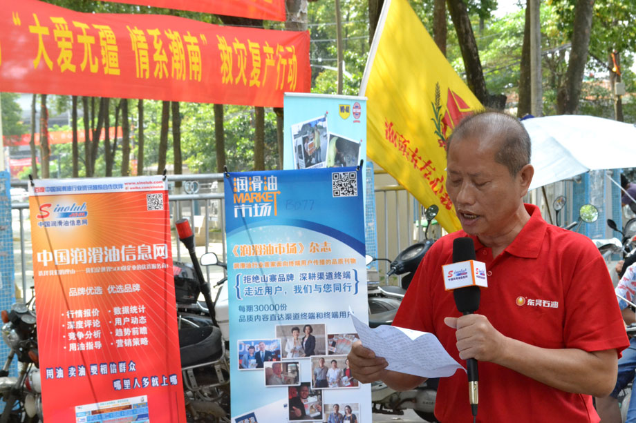9月14日上午,由中国润滑油信息网、《润滑油市场》杂志组织发起的“大爱无疆,情系潮南”救灾复产公益行动启动仪式,在汕头市潮南区文化宫前如期举办。汕头市有关行业协会领导及多家本土知名媒体出席了本次活动,物资捐赠单位东昊石油集团、WD-40公司中国子公司也派出专业技术指导人员赶赴现场,为受灾车主、企业代表进行用油示范及车辆、设备维护指导。